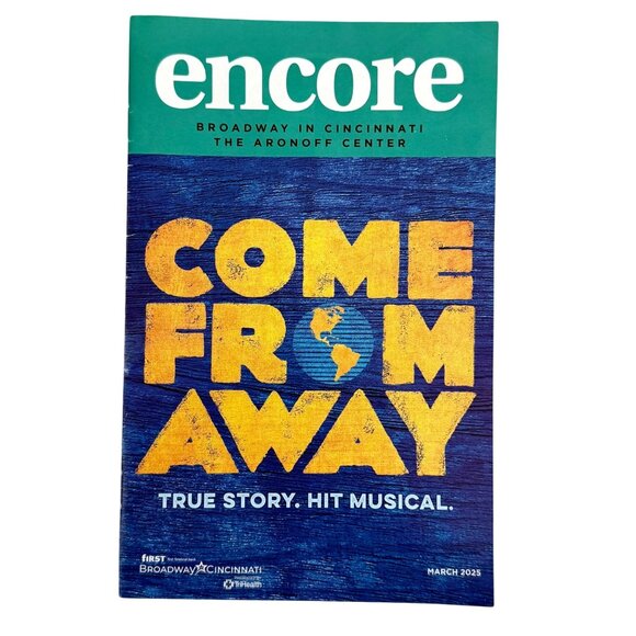 Celebrate compassion and community with this authentic Encore edition program from the Come From Away U.S. National Tour at the Aronoff Center for the Arts in Cincinnati, Ohio (March 2025). This acclaimed musical, directed by Christopher Ashley (Tony Award winner for Best Direction of a Musical), continues to move audiences worldwide with its real-life stories of kindness following the events of 9/11.