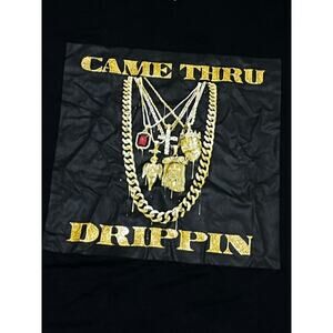 Make a statement with this striking black men's t-shirt featuring the phrase 'Come Thru Drippin' in bold gold lettering!