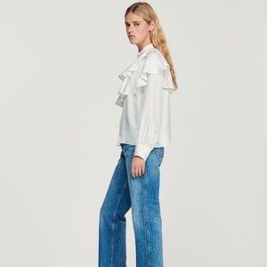 Flowing silk shirt with long sleeves, gathered cuffs, a button fastening and large ruffles.