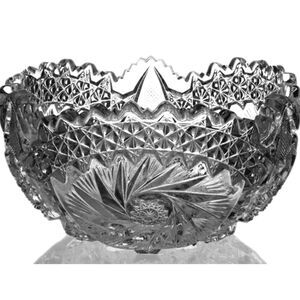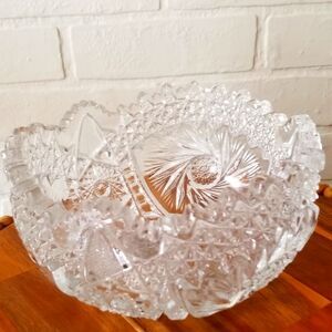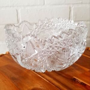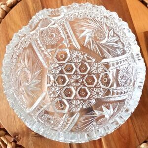 Here is a stunning piece of American glass. Comet in the stars by US Glass. Clear glass Hobstar pattern with a saw tooth scalloped rim. Absolutely stunning in person. Excellent condition with no chipping or cracking.