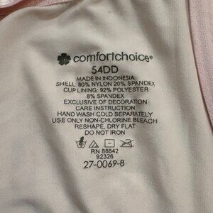 This listing is for a Comfort Choice support bra in size 54DD, never worn and in excellent NWOT condition. The bra is made with a smooth, stretchy nylon-spandex blend and features an underwire design that provides structure and lift. The soft blush pink color is neutral and feminine.