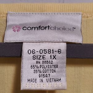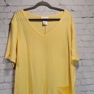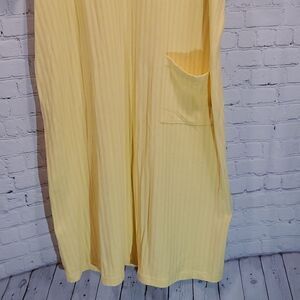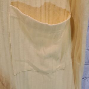 In very good used condition no flaws. Bright yellow with ribbed texture. 1 front pocket, short sleeves, and a v neck. Great as a nightgown, cover up, or summertime robe.
