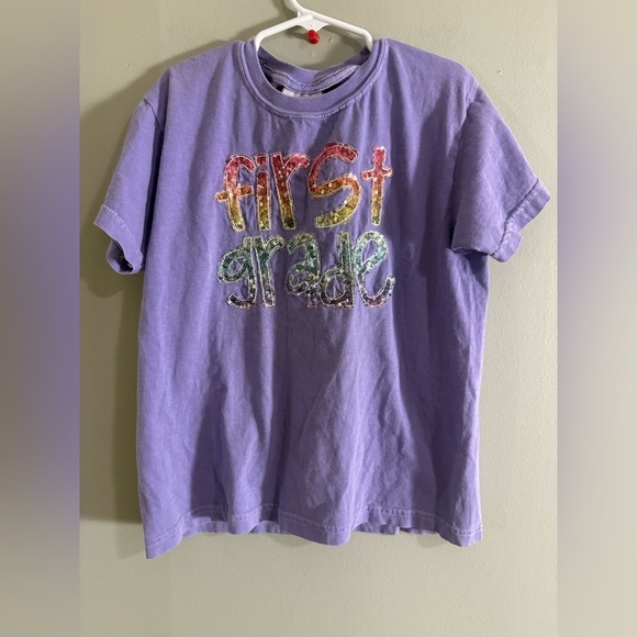 Adorable Comfort Colors “First Grade” short sleeve tee in soft lavender purple! Features rainbow sequin lettering across the front — perfect for the first day of school or school photo day. Made from Comfort Colors’ signature heavyweight 100% cotton garment-dyed fabric for a cozy, vintage-style feel.