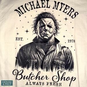 #ComfortColors #MichaelMyers #HalloweenTee #HorrorMovieStyle #ButcherShop #GraphicTee #VintageInspired #SpookySeason #FestivalReady #UnisexStyle #DenimAndFelt