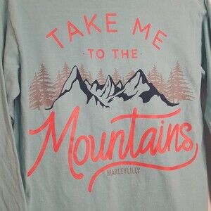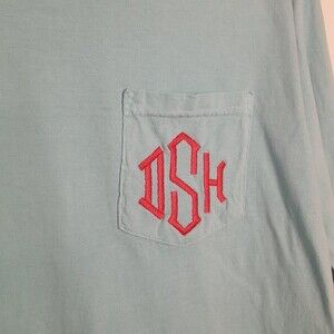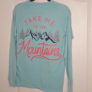 Long sleeve t-shirt by Comfort Colors. Back features "Take me To the Mountains" design, front features a pocket with dark pink monogram initials (DHS/DSH depending on how you read them). The monogram sews closed the pocket, so it is a decorative pocket only. size Small. Washed but never worn.