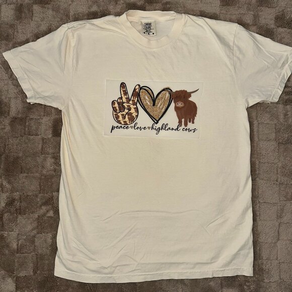 This Super Cute Comfort Colors Tee Is Handmade by ME. Features the cutest "PEACE LOVE & HIGHLAND COWS" Transfer. Get it in the Cutest Comfort Colors Tee In the color IVORY