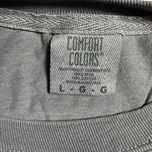 This short sleeve tee from Comfort Colors features a striking graphic design on the front, showcasing a bold checkerboard pattern. The gray color provides a versatile backdrop, making it a stylish choice for casual outings. Size Large. Smoke free home. Never worn.