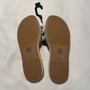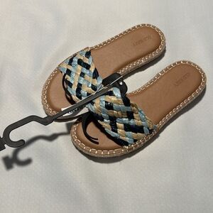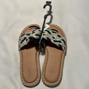 This is new with tags. All man made materials. Comfort footbed. Standard width. Crochet uppers. The uppers are shades of blue. So cute.
