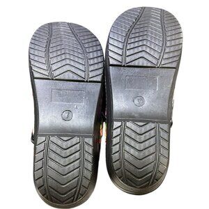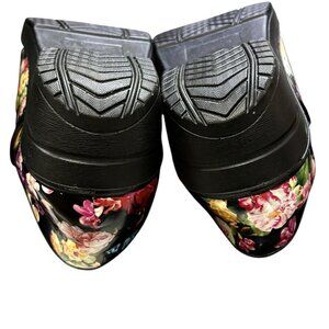 Comfort Trendz clogs in a colorful floral print. All manmade materials. Faux patent leather uppers. Heel height is approximately 1.75” with a platform height of approximately .5”.