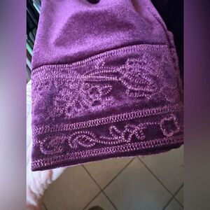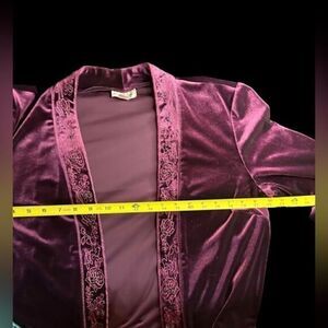 Comfort and glamour! Coldwater Creek size 12 beaded velvety velour 2-pc pull on pant and open cardigan loungewear in a beautiful burgundy/ plum color. No beads missing, in excellent, like-new, pre-owned condition. Gorgeous! Runs small please see measurements