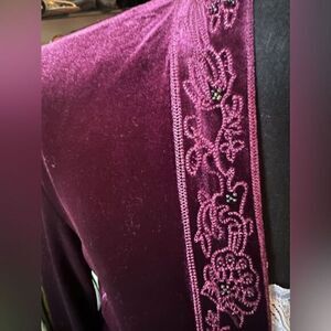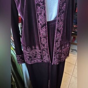Comfort and glamour! Coldwater Creek size 12 beaded velvety velour 2-pc pull on pant and open cardigan loungewear in a beautiful burgundy/ plum color. No beads missing, in excellent, like-new, pre-owned condition. Gorgeous! Runs small please see measurements
