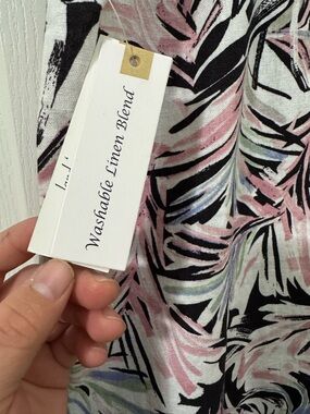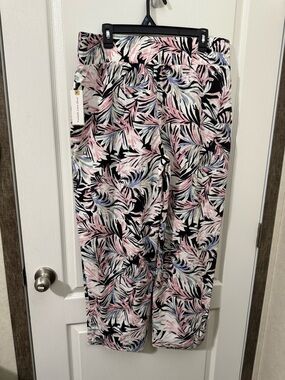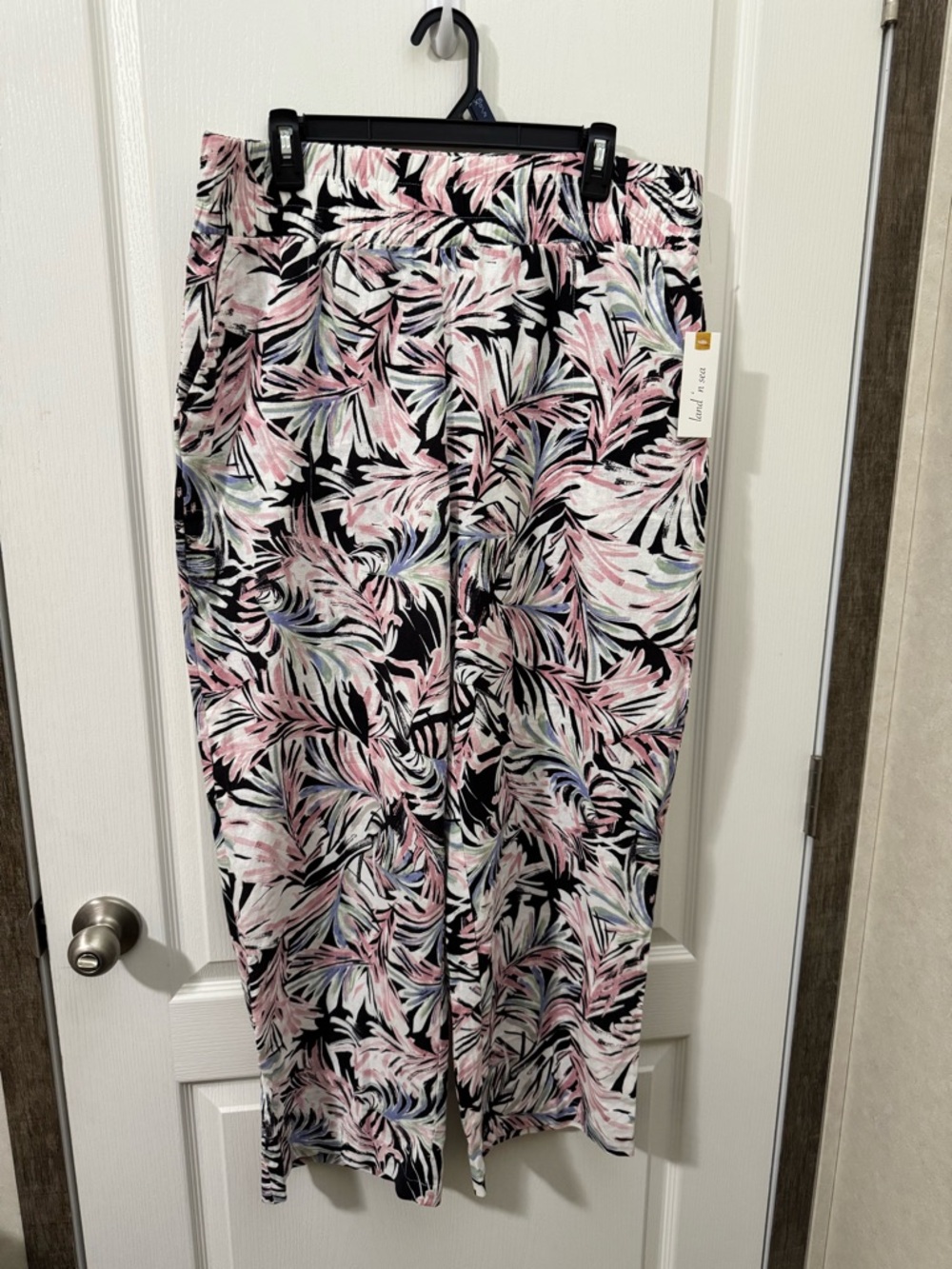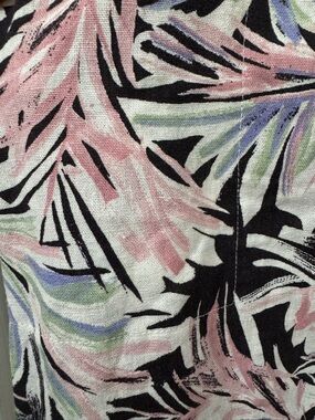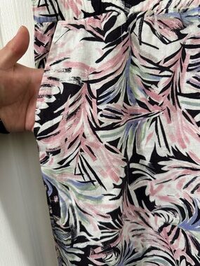 Lightweight wide leg pants in a black base with pink and pastel tropical leaf print. Soft, flowy fabric designed for all-day comfort. Elastic waistband for easy fit and wear. Versatile style that pairs well with tees or blouses.