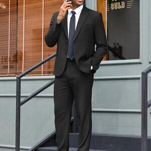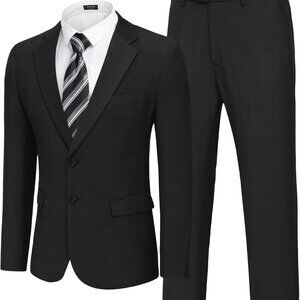 Features: Comfortable, soft fabric blazer and matching tuxedo pants. The blazer has a two-button closure, notched lapel, side vents, flap pockets, and a full lining for a polished look. The pants feature a flat front, zipper fly with hook and button, and a solid, versatile color. Good stretch, moisture-wicking, and wrinkle-resistant fabric makes it perfect for dressing up or down.