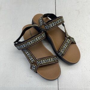 Stylish sandals with intricate black and tan pattern. Comfortable and chic for everyday wear. Worn only once.