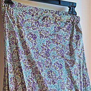 This is a very comfortable maxi skirt. It has purple paisley, aqua flowers, and olive stems on a white background. I got this at a farmers market. 100% Rayon, Made in India, no name brand. It has a draw string and elastic. One hole of the draw string is frayed, but it doesn't show when you tie the bow. It measures 37" long, and 26" waist that can stretch with the elastic a couple more inches. It's been one of my favorite skirts but sadly I "outgrew it."