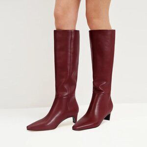 Features: These knee-high boots are crafted with faux leather upper, offering a sleek look with a soft padded insole for all-day comfort. The pointed square toe and kitten heel add a chic touch, while the wide calf design (shaft circumference around 15.75 inches) makes them easy to slip on and perfect for broader calves.