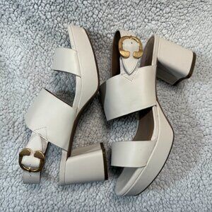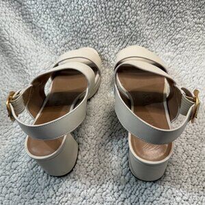 These gently worn, Camera Platform Sandal, available in Eggshell Leather. This women's platform heel Platform Sandal is great for everyday. Rich with shoe comfort, the Camera Platform Sandal in Eggshell Leather possesses a diamond flex outsole, a ortholite foam insole and even more amazing shoe comfort technologies. These have a small scuff towards bottom left heel.