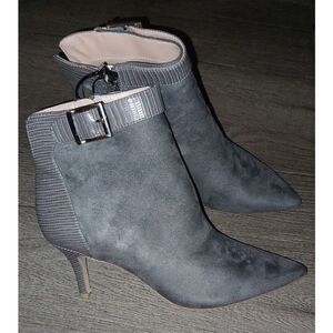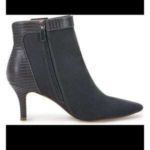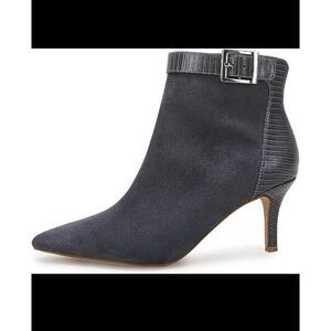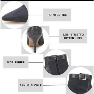 Feature: Ankle boots for women, pointed toe, low stiletto kitten heel, side zip, ankle buckle strap, faux sude and print leather, solid color