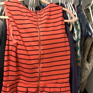 Color is pink with black stripes. Pockets. Scoop neck and zip back. A line skirt that is pretty full. Very flattering. Cuts in at waist and goes out. A bit stretchy in the best way