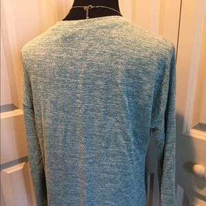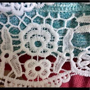 Beautiful green/ cream sweater by New Directions weekend in size medium. Mixture of polyester, rayon and cotton. Has pockets in the front. Lace on the bottom.