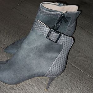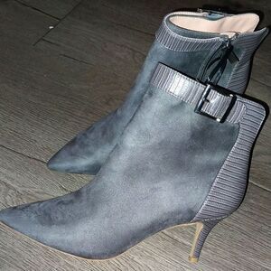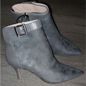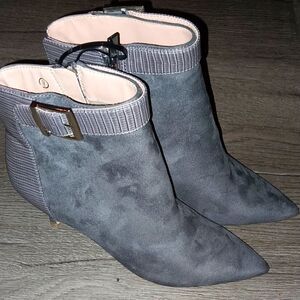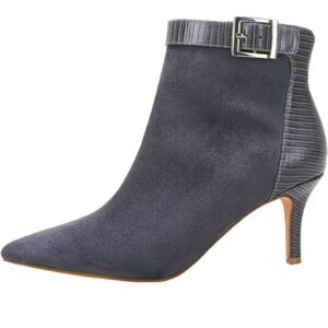 Feature: Ankle boots for women, pointed toe, low stiletto kitten heel, side zip, ankle buckle strap, faux sude and print leather, solid color