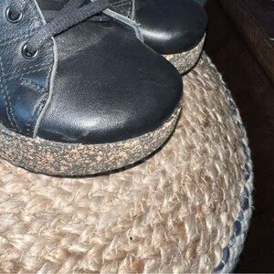 Smooth Black Leather Upper with a Cork Design Platform Sole. Unisex. Extra Details in Photos along with Brand Descriptors. Unique Shoes.