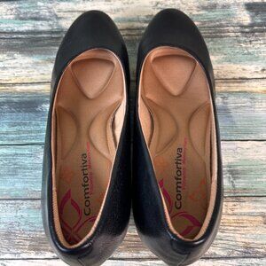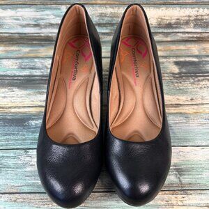 Comfortiva Womens 10M Classic Pumps Black Leather Dress Formal Comfort Work Shoe. Normal light used wear to the soles, uppers and inner shoe; no excessive wear or damage.