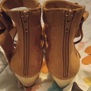 Pre owned by me worn once lightly used in very good condition like new no flaws! Has back zipper for easy on and off, side tassel on ankle strap, very comfortable and looks awesome! I got compliments when I wore them once! Faux suede!