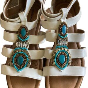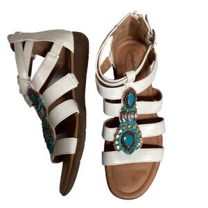 Description: Comfortview Silas White with Turquoise, Gold, & Clear Beads Gladiator Cushioned Sole Sandals Back Zip and Double Buckle Ankle Straps, Rubber Wedge Outsoles.