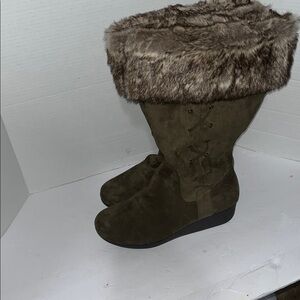 Stylish olive boots with faux fur trim. Lace-up detail adds charm. Ideal for cold weather.new with out Tag.