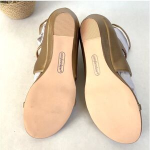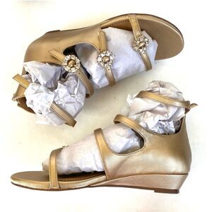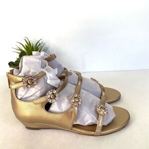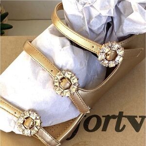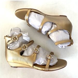 Features: comfort view gold low wedge sandals, faceted sparking crystal details, zip back for easy in and out, chic, classy, versatile, timeless, goes with everything, summer, vacation, resort, cruise, special event, comfortable, versatile