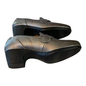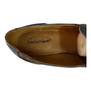 These Comfortview slip-on loafer style shoes offer both style and comfort. The metallic gray faux leather makes them a versatile addition to any wardrobe, while the padded insole provides all-day comfort. The 1.5-inch heel adds a subtle lift, making these shoes suitable for both casual and formal occasions.