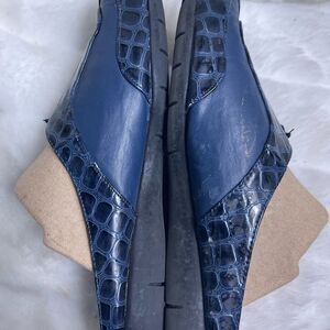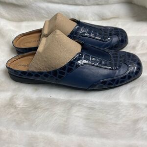 Comfort view Navy blue faux leather and patent crocs print slides sandals SZ8.5M