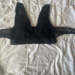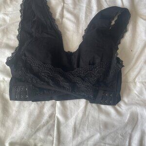 Soft and stylish black lace bralette with a cute lace cross detail that clips across the front. Perfect to wear under a sheer top or rock it solo for a bold, feminine look! Super comfy and flattering — a must-have layering piece! Fits cup sizes B and C.