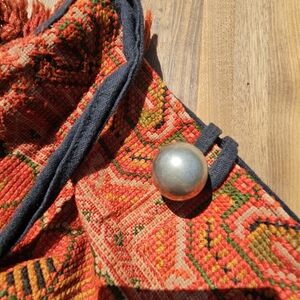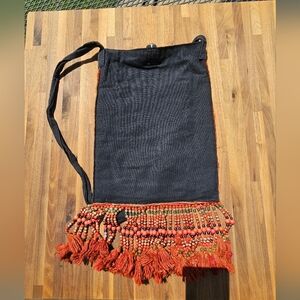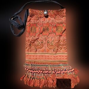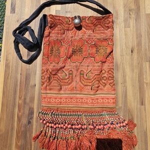 Comfy Bohemian Orange Floral Aztec Beaded Fringe Bag with button closure. Comfy