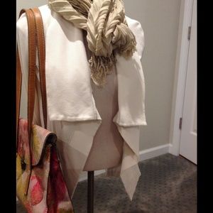 The super comfortable cardigan is made out of a sweatshirt type, material drapes in the front. beautiful cream color wear with anything!! no stains or pilling. Worn once.