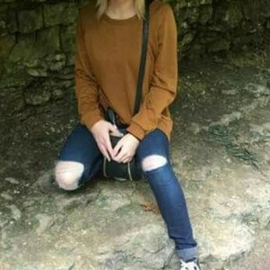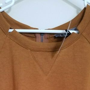 Golden brown, oversized and super soft sweatshirt. Zipper in back. Nice details: Decorative v-shaped notches on crew neck, splits on each side, two front pockets. Only worn once!
