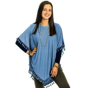 Silky-soft periwinkle blue pancho with mini tassels is comfywear wear. One size — up to 12-14. Width 36" at shoulders x length 30" (center line from neck to V of hem, excluding tassels). Tassels are 1.5" long.100% Rayon. Wash gentle, hang or lay flat to dry, low heat to iron. NEW, never worn.