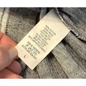 This Comfy USA Gray White Striped Tunic in size Large is a classic and comfortable piece perfect for a relaxed coastal or bohemian look. Made of 100% cotton, this tunic features a round neckline, 3/4 sleeves, and a button-up style. Designed and manufactured in the United States.