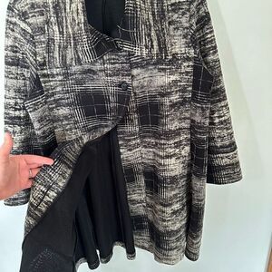 Comfy USA Women’s Lagenlook Munich 2 Button Long Line 3/4 Sleeve Abstract Windowpane Black And Cream Jacket