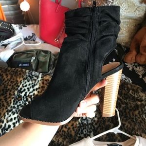 Black heels with a thick heel for comfort! Cute with jeans leggings or dresses! Worn once! No wear! Bottom had some dust! But they are good to go half price!