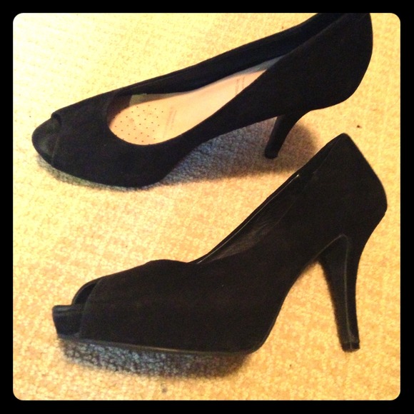 Mid height peep toe heel. Gently worn. They are size 11 but feel a bit more like 11 1/2. Black soft suede. Great condition.
