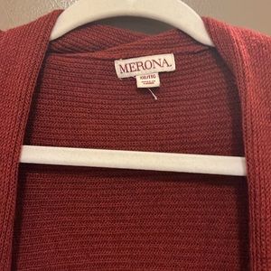 Open front, rust colored, oversized, super comfy sweater with pockets. Some pilling (pictured) that could probably be removed with a sweater shaver.