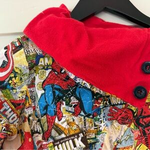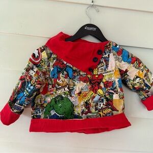Vibrant hoodie with comic book design. Features red hood and colorful graphics.