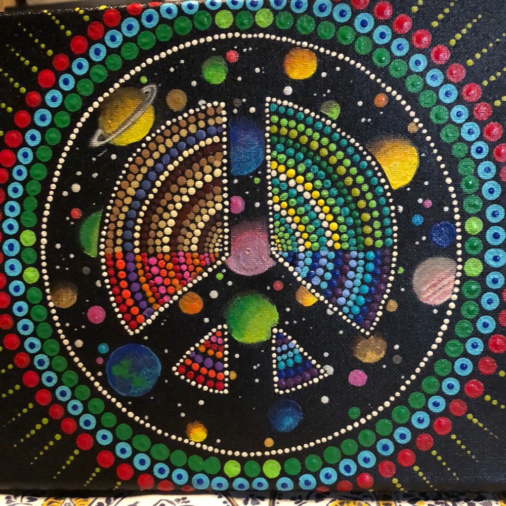 The artist's ( my husband) vision behind this 8 X 10 black canvas piece is cosmic space is any topological space that is a continuous image of some separable metric space. And Yes! We watch the heavens always