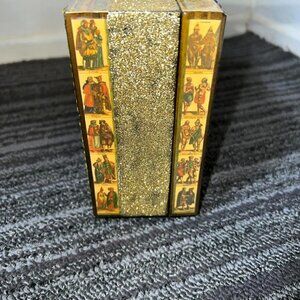 Comic book rhinestone sequin embellished cigar box purse with handle. Orange felt lining. 7.25”x5”x2.75”