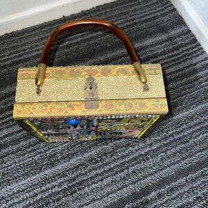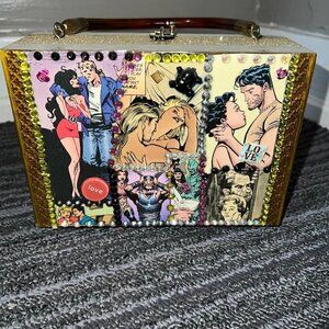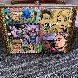 Comic book rhinestone sequin embellished cigar box purse with handle