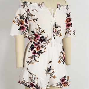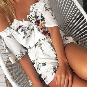 Coming up Roses Romper from mindfulbohemianshop.com it's an off white with vintage rose print has a long tassle tie in front for off the shoulder and fits true to size off the shoulder strapless