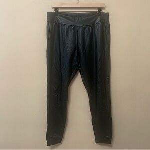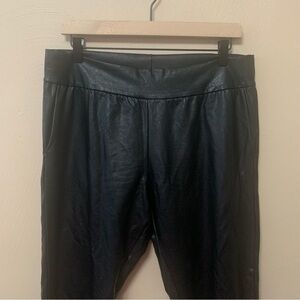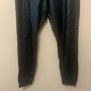 Faux leather jogger pant, side slant pockets, banded waist and ankles, pull on styling.