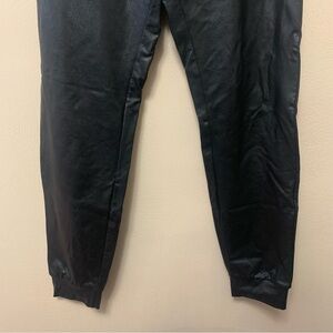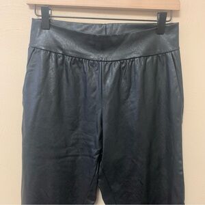 Faux leather jogger pant, side slant pockets, banded waist and ankles, pull on styling.